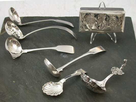 to include a pair of fiddle pattern sauce ladles, with marks for Dundee circa 1818, maker Alexr. Cameron, initialled, an old English pattern sauce ladle, Edinburgh 1807 (with later pierced bowl), a fiddle pattern caddy spoon, Newcastle circa 1800, with shell bowl, initialled, another sauce ladle, Dublin 1820, a decorative continental spoon and a continental rectangular box with hinged cover, cast with masks and foliate swags