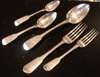 with marks for Edinburgh and London, various dates and makers, to include six tablespoons, six dessert spoons, six table forks and six dessert forks, monogrammed, two table forks, ten teaspoons, three sauce ladles and a set of twelve fiddle pattern teaspoons with marks for Glasgow, maker PW, initialled