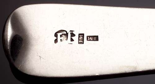 Four marks: JM twice and offset, capital E, capital B?, possibly by John Mackie, of fiddle pattern