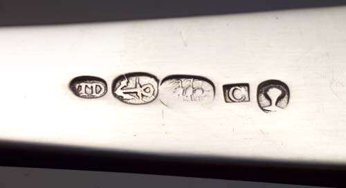 with marks for Greenock, circa 1820, Thomas Davie, five marks, TD, fouled anchor, ship, C, green oak, of old English pattern, engraved initials