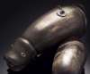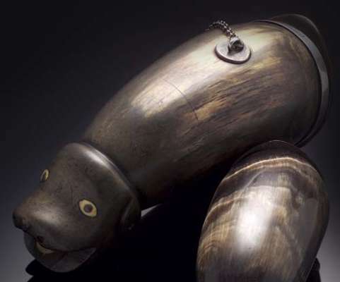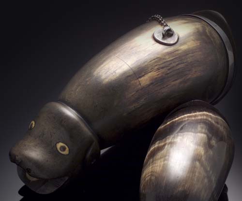 of large size, the mull of curved form with boldly carved seal's head with a slightly humourous expression and protruding tongue, the lid with simple mounts, shaped hinge, the top with a chain and part spoon