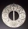 of annular form, with engraved and niello decoration incorporating circular panels, scrolls, chequers and Celtic knots, inscribed to the reverse, with two sets of initials and dated 1768