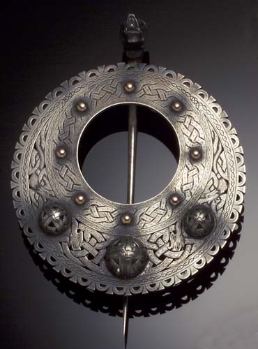 with marks for Edinburgh 1892, maker R&HBK, of annular form, pierced and engraved with celtic knotwork borders, applied with three similarly decorated bosses and a border of gold studs, the pin with cast mythical beast's head terminal, with red stone set eyes