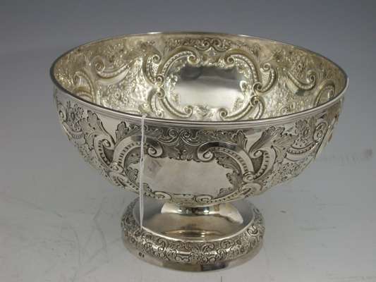 with marks for Birmingham 1892, maker T. Latham & E. Morton, of hemispherical form on pedestal foot, decorated with flowers, foliage and C-scrolls