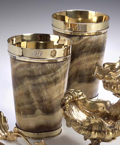 with marks for London 1803, maker Thomas Phipps & Edward Robinson II, each of tapered cylindrical form with gilt mounts and interiors, initialled
