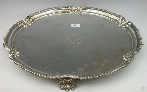 with marks for Sheffield 1897, makers J.M, J.M. of lobed circular form, gadroon and anthemion clasped border, central engraved monogram, all on four anthemion feet