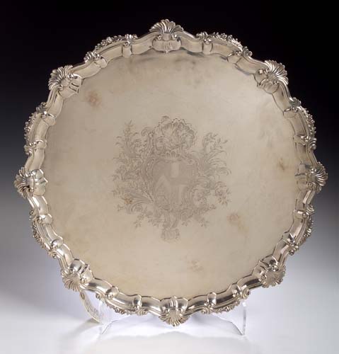 with marks for London 1752, possibly William Bond, of rounded serpentine anthemion clasped border, central engraved armorial for NORREYS of SPEKE, Lancashire impaled by another inscribed to reverse "Ex Dono Mars Pearson - Auandam Nutricis," all on muscular claw and ball feet