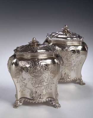 with marks for London 1762, makers Daniel Smith and Robert Sharp, of bombe rectangular form, gadroon border, chased floral and C-scroll decoration, cartouche later engraved crest, all on stylised shell feet,