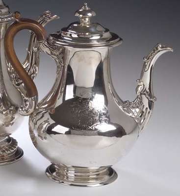 with marks for London 1834, maker Paul Storr, of baluster form on circular foot, with leaf capped spout and handle and mushroom finial to the slightly domed hinged cover, with engraved armorial