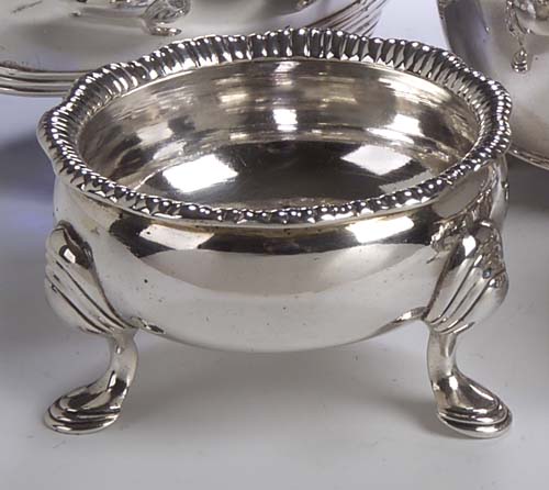 with marks for Edinburgh 1759, James Welsh, each of cushioned circular form, with gadrooned everted rim, on three hoof feet