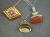 with bead borders, applied to the centre with a blue enamelled star with central half pearl and rose cut diamond circular cluster, together with two stone set fobs (3)