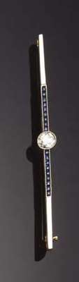 with central millegrain collet set old European cut diamond of approximately 0.50cts, flanked to either side by channel set square cut sapphires