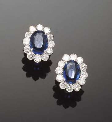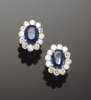 each with central claw set oval cut sapphire within a surround of round brilliant cut diamonds