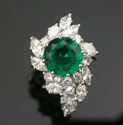 claw set to the centre with a circular cut synthetic emerald, within a spiralling scroll shaped surround, claw set with graduated round brilliant and marquise cut diamonds
