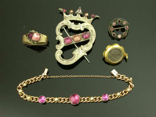 to include a floral pendant set with a carved garnet flowerhead applied to the centre with a half pearl, with locket panel to reverse, a 9ct gold curb link bracelet collet set with three graduated circular cabochon cut pink stones and seed pearls, a scarf clip applied to the front with a gem set insect, a Scottish brooch and a circular brooch (5)