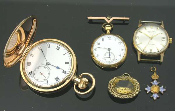 to include an 18ct gold keyless wind open faced fob watch, a rolled gold keyless wind hunter cased pocket watch, a gentleman's Rotary wrist watch, and a miniature M.B.E. (George V)