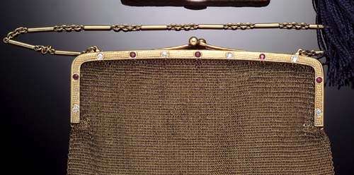 composed of woven mesh links, with engine turned snap fastening alternately collet set to one side with round brilliant cut diamonds and rubies, with suspension chain, stamped 14K