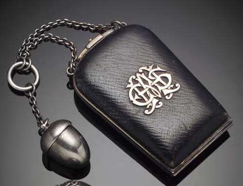 with marks for London, no date letter, maker Henry William Dee, also inscribed Ortner & Houle, 3 St James's St, of tapered rounded rectangular form, with applied monogram and push button fastener, the royal blue velvet and taffeta fitted interior containing bodkins, a ribbon threader, a needle case and thread reels, the whole suspended from two belcher link chains, also suspending an acorn shaped thimble case, London 1869, same maker, with hinged cover and gilt interior, containing a white metal thimble