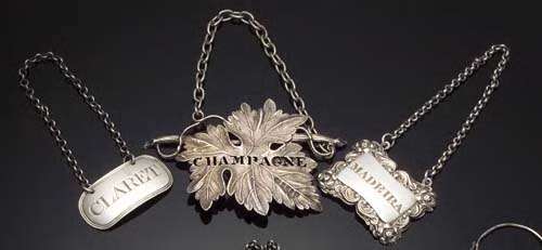 with marks for Birmingham 1839, maker Joseph Willmore, naturalistically cast as a vine leaf, pierced CHAMPAGNE, another bottle label, Sheffield 1829, maker SC Young &Co, of shaped rectangular form with scroll border incised MADEIRA, and an oval form wine label, London 1818, by IR, with reeded border incised CLARET (3)