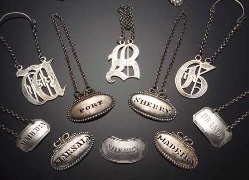 to include a William IV label, with marks for Birmingham 1833, by Joseph Willmore, of curved form with reeded border incised SHERRY, a canted rectangular example, London 1824, also with reeded border incised MADEIRA, another similar, Birmingham 1830, incised BRANDY, a set of four white metal oval labels with bead borders and bow surmounts, some stamped with 19th century naval ordinance mark to reverse, also a set of three white metal pierced letter labels (10)