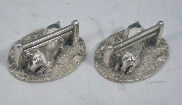 with marks for London 1903, maker's mark indistinct, each cast as a pig crouching under a fence, to a textured oval base, with retailer's mark to the underside for Searle & Co, 78 & 70 Lombard Street, London