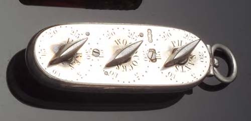 with marks for London circa 1868, maker Henry William Dee, of oval form, fitted to each side with three dials, inscribed Partridges, Snipes, Rabbits, Pheasants, Woodcocks and Hares, engraved with a coronet above initials, additionally inscribed to one edge Thornhill, 144 New Bond Strt, with suspension ring,