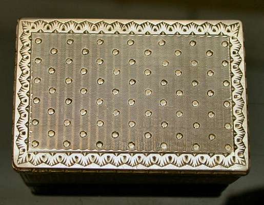 of rectangular form, wriggle-work and polka-dot engraved, within stylised foliate engraved borders, the hinged cover opening to reveal the gilt interior fitted with two square compartments each with flat hinged cover, the base also with hinged cover opening to reveal a shallow compartment
