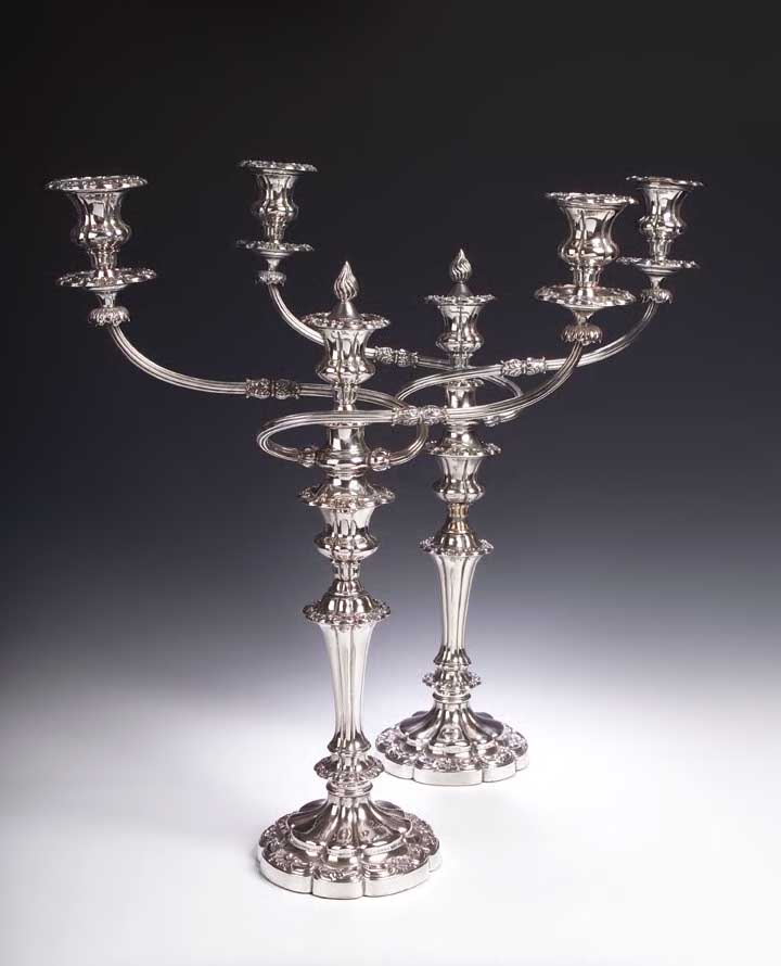 the lobed shaped circular bases beneath tapered columns and vase shaped capitals, with two reeded scroll branches, with C-scroll and shell decorated borders throughout