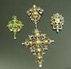 of openwork scrolling design, composed of two hinged parts, set throughout with circular cut garnets with closed back settings, with central baroque pearl set cross motif, a matching brooch and an emerald and seed pearl set pendant, also of pierced scrolling design (3)