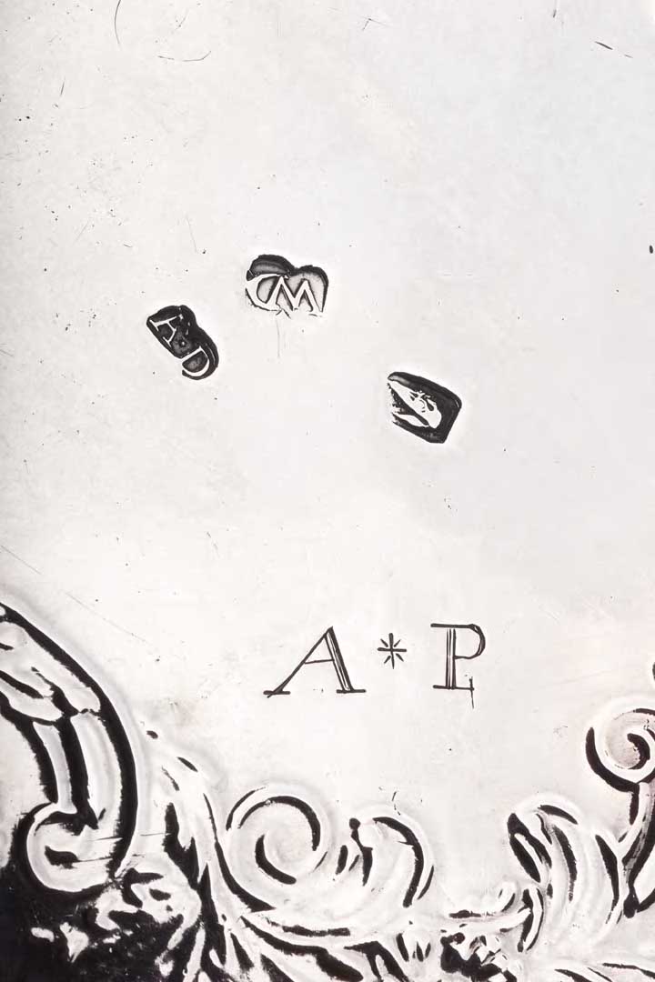 with marks for Jamaica circa 1780, three marks, Alligator Head, WD conjoined, AD, of shaped circular form, foliate chased band to the flat with crest to the centre and all raised on three cabriole legs, hoof feet