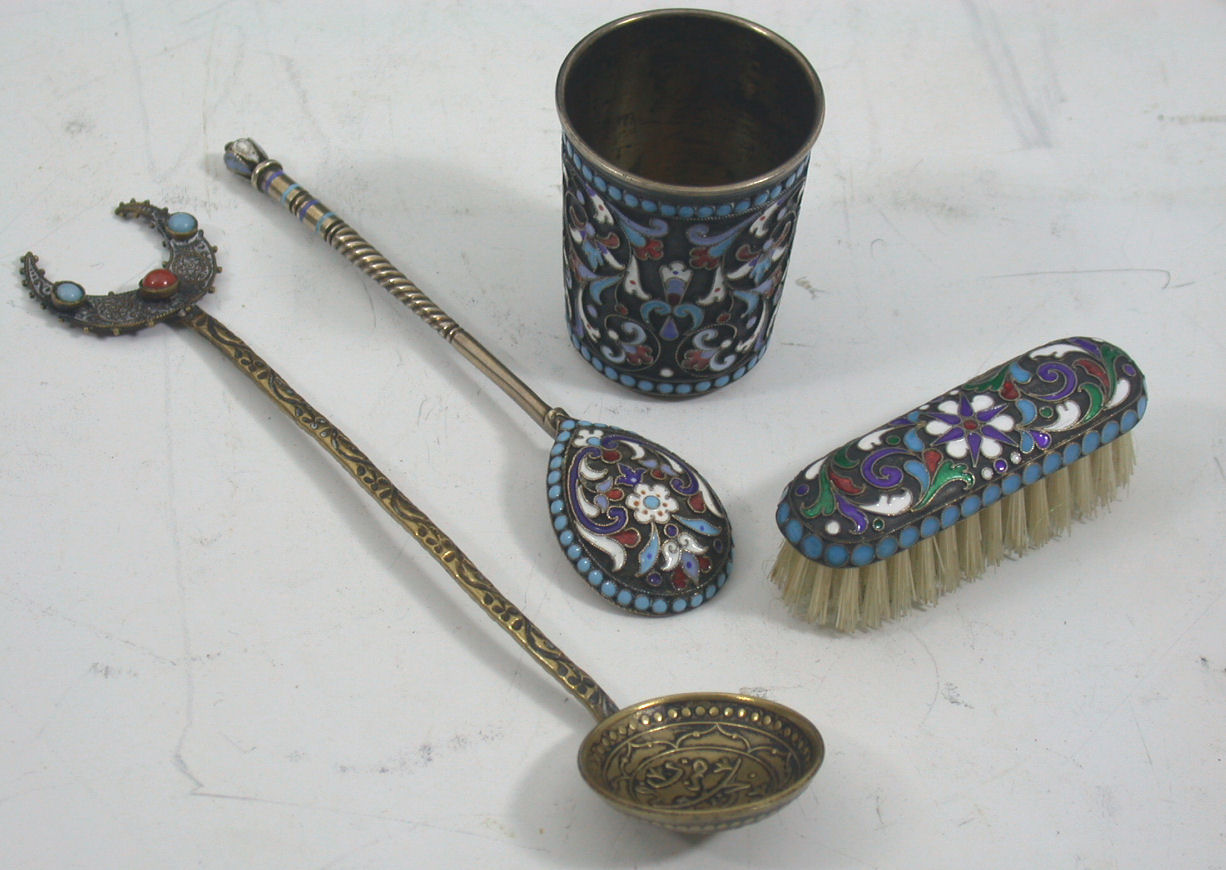 to include a tot cup, a miniature brush and a spoon each decorated with shades of red, blue and white enamels, together with an Eastern spoon (4)