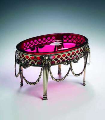 with marks for London 1906, maker Hancocks & Co, with pierced sides, raised on four lion mask capped tapered and reeded pilaster supports, suspending foliate swags interspersed with bow tied ribbons, with red glass liner