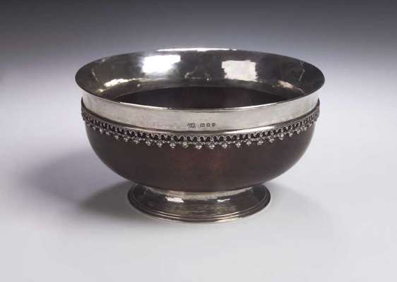 with marks for London 1937, the circular section turned wooden bowl with mounted flaring rim and cast lambrequin border, raised on a circular foot, inscribed to the underside OMAR RAMSDEN ME FECIT