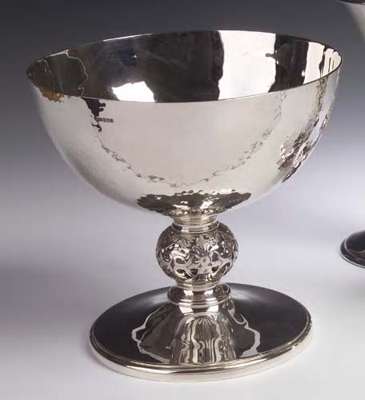 with marks for Edinburgh 1995, maker Hamilton & Inches, the hemispherical bowl, with planished finish, surmounting a foliate scroll pierced cushion shaped knop above the circular foot