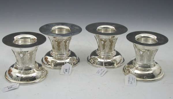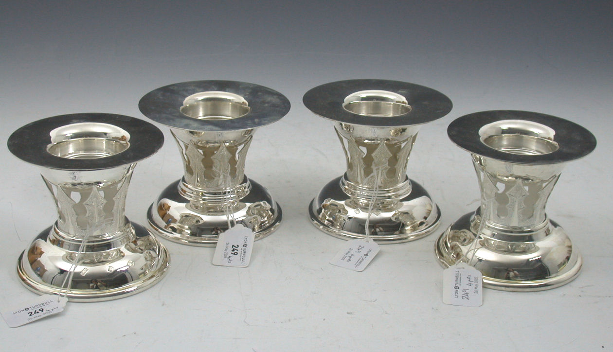 with feature hallmarks for Edinburgh 1997 and 2000, maker Hamilton & Inches, each composed of a domed circular base, beneath a tapered thistle leaf cast border supporting a planished circular bowl with everted rim and detachable broad rimmed sconce