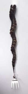 with marks for Edinburgh 1880, the handle of wrythen horn with a plain silver cap, the fork with four tines and ball knop