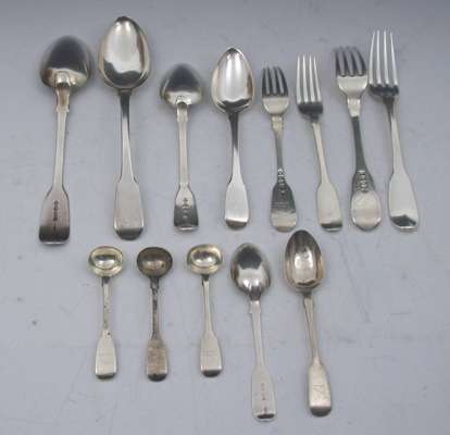 various dates, mostly Georgian and some Victorian, makers to include William Eley I, William Fearn & William Chawner II, William Eley II & William Fearn and George William Adams, comprising eleven table and dessert forks, twelve dessert spoons, seven tablespoons, six teaspoons, three condiment spoons and an electroplated dessert fork, most crested (51)
