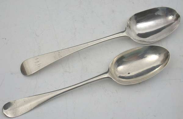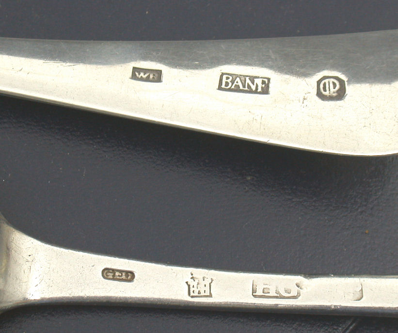 with marks for Banff circa 1785, maker possibly William Byres, stamped WB, BANF and with gothic Q, initialled, together with a Hanoverian pattern table spoon, Edinburgh circa 1760, struck with marks for both John Ged and Hugh Gordon (2)