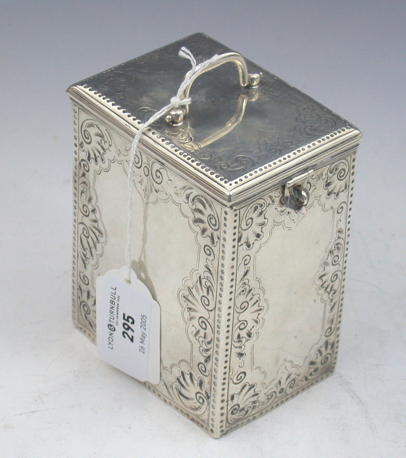 with marks for London 1775, maker possibly Samuel Meriton II, of upright rectangular form, with punch beaded borders and shell and scroll engraved borders, the flat hinged cover with central swing handle and hinged lock