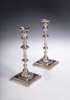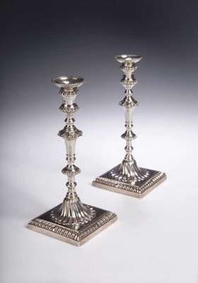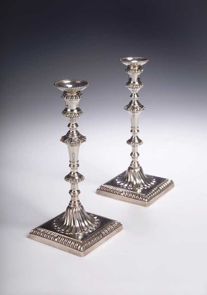 with marks for London 1767, maker IC, each of circular outline with detachable sockets, with bead and gadrooned borders, shaped circular knops, the columns with domed fluted supports surmounting the square gadroon-edge bases