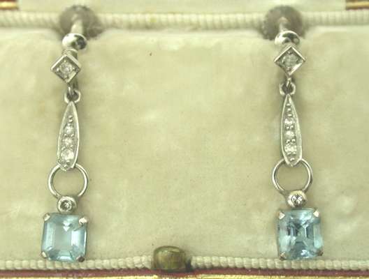 each composed of a corner claw set trap cut aquamarine, suspended from an oval link set with three graduated single cut diamonds, surmounted by a box set single cut diamond, contained in a fitted case