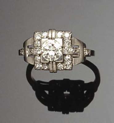 box set to the centre with a round brilliant cut diamond within a square surround, set with single cut diamonds, flanked by shoulders of interwoven design
