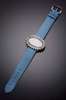 the slim oval dial pave set with single cut diamonds and gilt hands, with spiralling claw set marquise cut diamond bezel, fitted to a turquoise satin strap