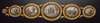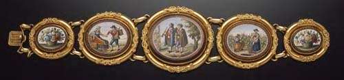 composed of five graduated oval panels depicting musicians, grape pickers, a courting couple and two floral arrangements, each within a goldstone surround within tubular borders with applied cannetille decoration