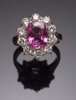 the central claw set oval cut pink sapphire within a surround of round brilliant cut diamonds
