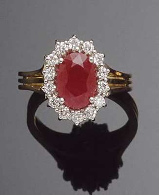 claw set to the centre with an oval cut ruby within a surround of round brilliant cut diamonds, with trifurcated shoulders and reeded shank