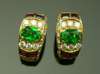 of curved design, each set with graduated round brilliant cut diamonds and pairs of square cut rubies around the central oval cut green stone