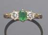 the central claw set oval cut emerald flanked to either side by a round brilliant cut diamond