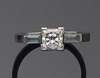 corner claw set with a princess cut diamond flanked to either shoulder by a channel set pale blue baguette cut stone