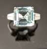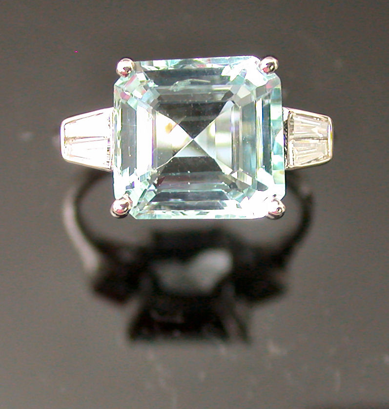 corner claw set with a trap cut aquamarine, flanked to either side by two tapered baguette cut diamonds, stamped 750